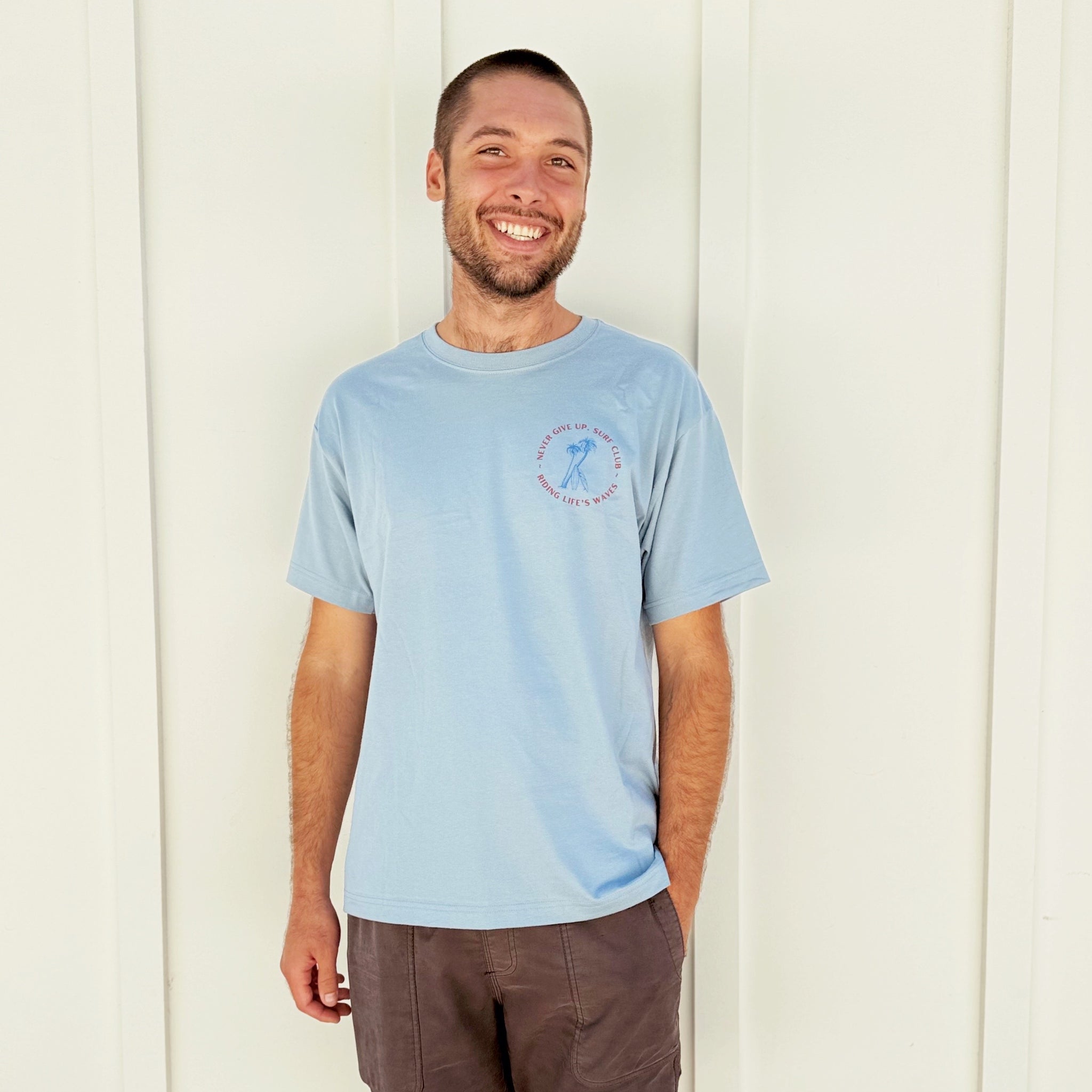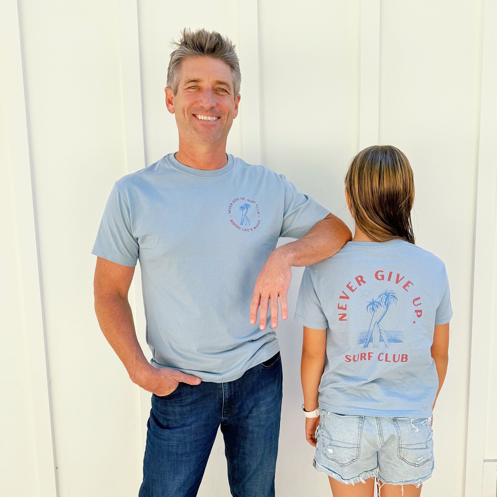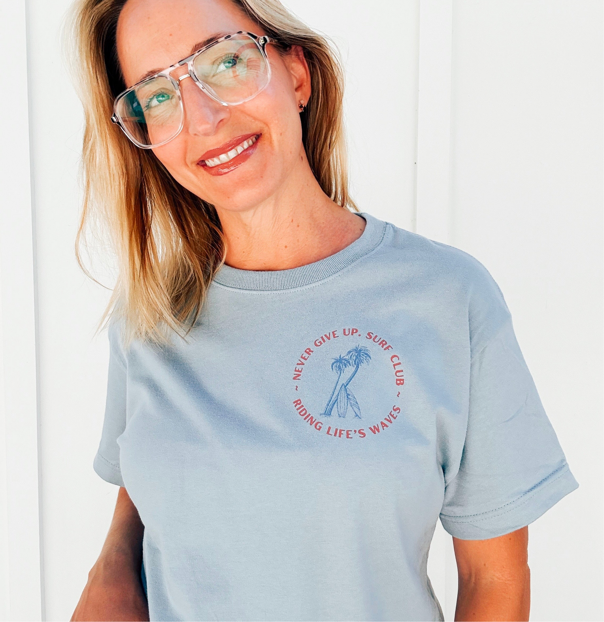 Salt in the air, hope on your back. This tee is for the brave ones — those who fall, wipe out, and paddle back out anyway. With a palm-lined shore and twin surfboards sketched in sea-washed blue, our NEVER GIVE UP. SURF CLUB design reminds you to: ride life’s waves — don’t let them ride you.
