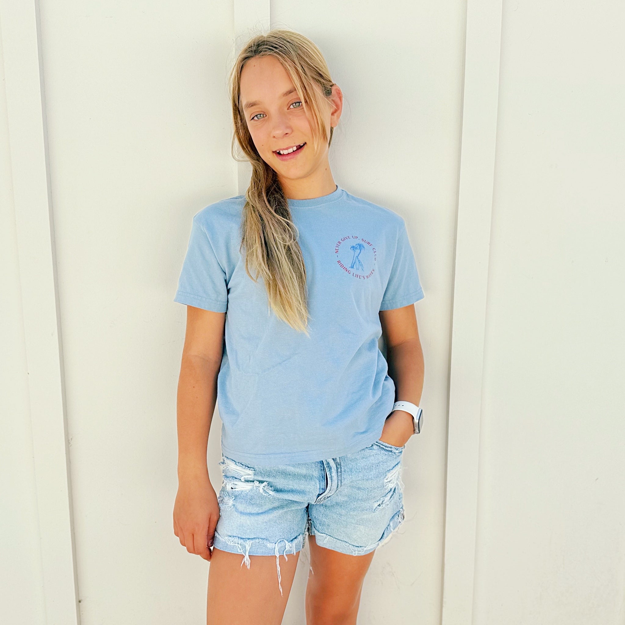 Kids' sizing is associated with age. This is a boxier, heavier-weight cotton than our other kids' tees. Model is 11 years old, wearing the 10-12.